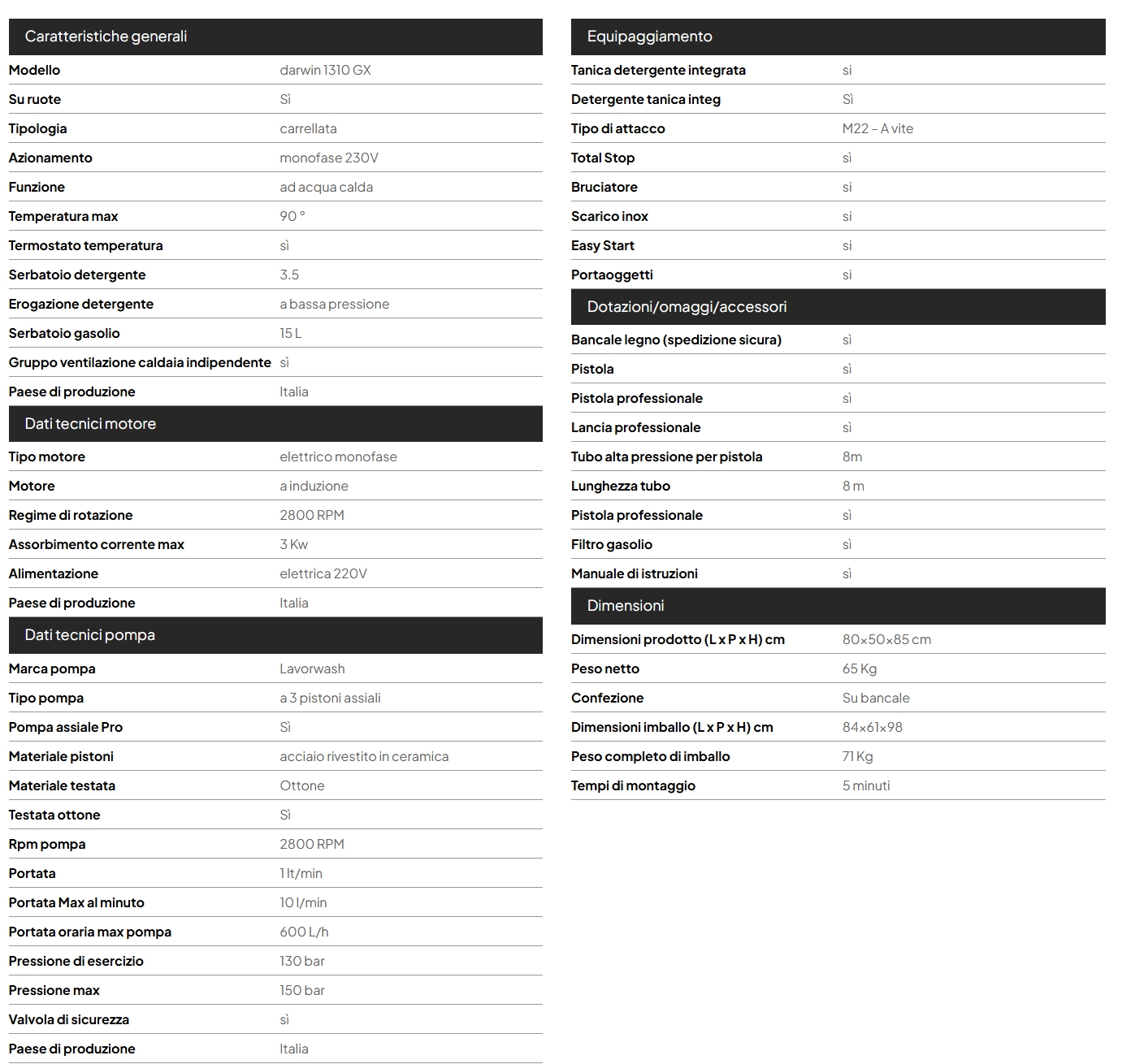 IDROPULITRICE DARWIN 1310 GX 230/50 ACQUA CALDA PROFESSIONALE 150 BAR - LAVOR