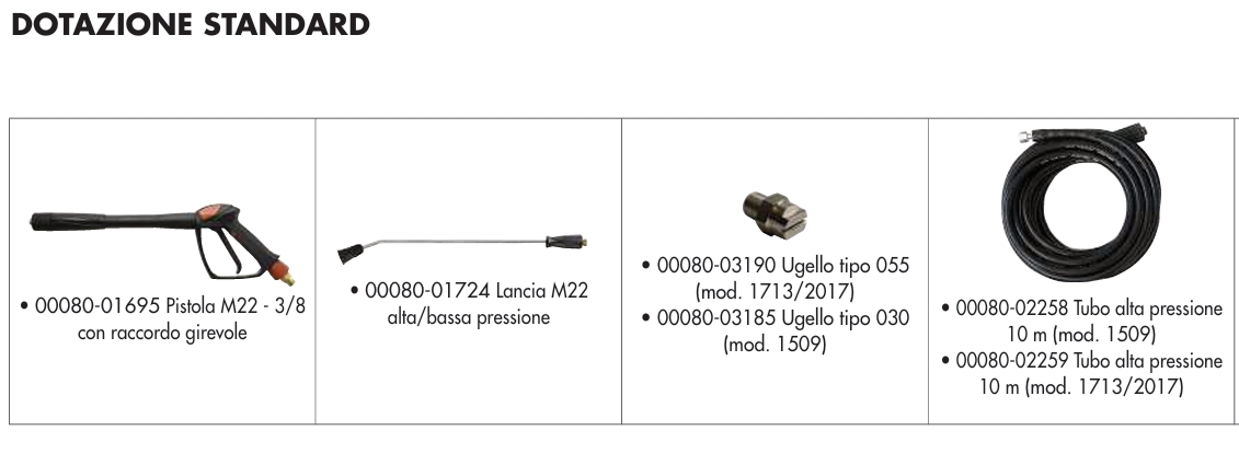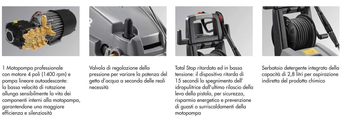 - Tre pistoni con rivestimento ceramico, pistoni in ceramica (solo modello 1713) pompa lineare con testata in ottone nichelato con tenute ad alta temperatura e valvola by-pass incorporata